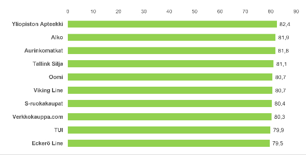 | Matkailu: Aurinkomatkat, TUI, Tjäreborg, Finnair, Tallink Silja, Viking Line, Eckerö Line, VR, OnniBus ja HSL. Päivittäistavarakaupat: K-ruokakaupat, Lidl ja S-ruokakaupat. Pankit & Vakuutus: Aktia, Danske Bank, Nordea, OmaSp, OP Pankki, S-Pankki, Säästöpankki, Fennia, If, LähiTapiola ja Pohjola Vakuutus. Rahapelit: Veikkaus. Sähköyhtiöt: Fortum, Helen, Oomi, Vattenfall ja Väre. Teleoperaattorit: DNA, Elisa/Saunalahti ja Telia. Omnichannel: Alko, Amazon, Biltema, Clas Ohlson, Gigantti, IKEA, Motonet, Musti & Mirri, Power, Sokos, Stockmann, Tokmanni, Verkkokauppa.com, Yliopiston Apteekki, Zalando ja XXL. Terveyspalvelut: Mehiläinen, Pihlajalinna ja Terveystalo. |