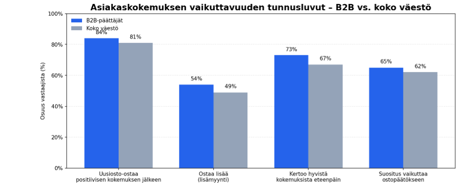 Asiakaskokemuksen vaikutus korostuu juuri niissä kohdissa, jotka vaikuttavat B2B-yritysten kasvuun, sopimusten jatkuvuuteen ja ristiinmyyntimahdollisuuksiin.